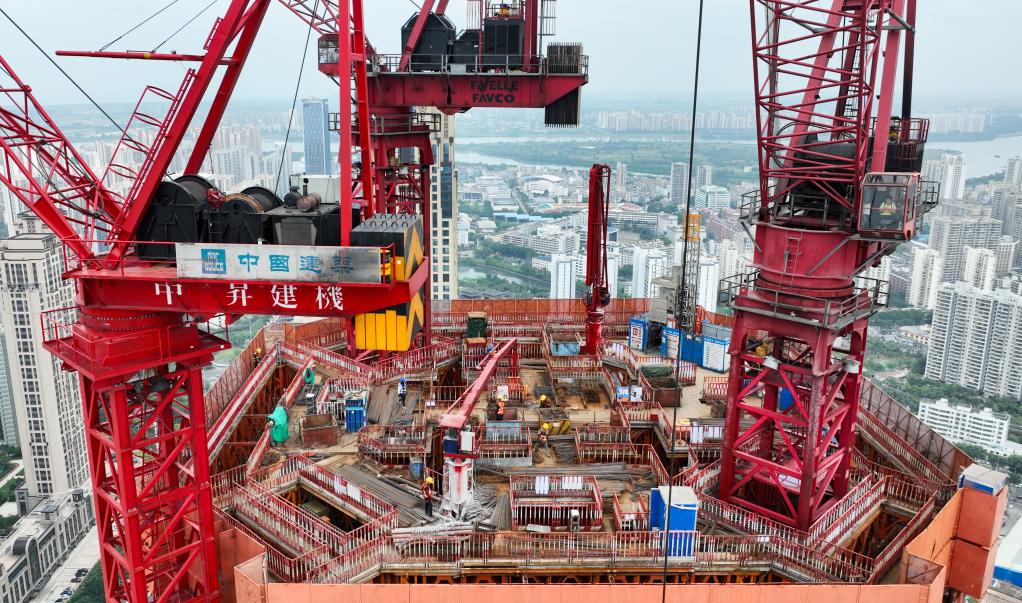 4月12日,工人在海口市海南中心項(xiàng)目施工作業(yè)(無(wú)人機(jī)照片)。新華社記者 楊冠宇 攝