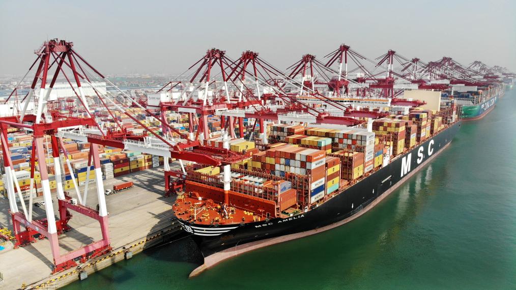 3月13日,貨輪在山東港口青島港裝卸集裝箱(無(wú)人機(jī)照片)。新華社記者 李紫恒 攝