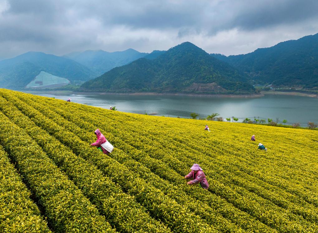 4月7日,茶農(nóng)在浙江省寧波市鄞州區(qū)橫溪茶園采茶(無(wú)人機(jī)照片)。新華社發(fā)(胡學(xué)軍攝)