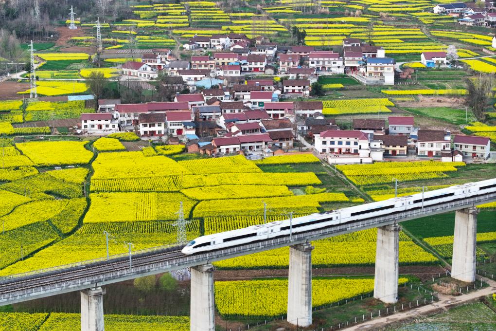 3月20日,西成高鐵線(xiàn)上的列車(chē)駛過(guò)陜西漢中市南鄭區(qū)陽(yáng)春鎮(zhèn)(無(wú)人機(jī)照片)。新華社記者 邵瑞 攝