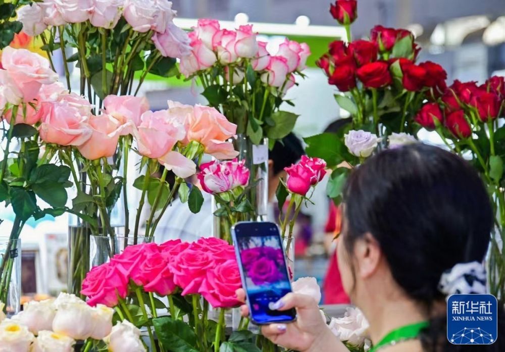 觀眾在國(guó)貨特色潮品展區(qū)云南展臺(tái)拍照,云南展臺(tái)為本屆消博會(huì)準(zhǔn)備了8000余支、20多個(gè)品種的云南本土鮮切玫瑰。新華社記者王楚天 攝