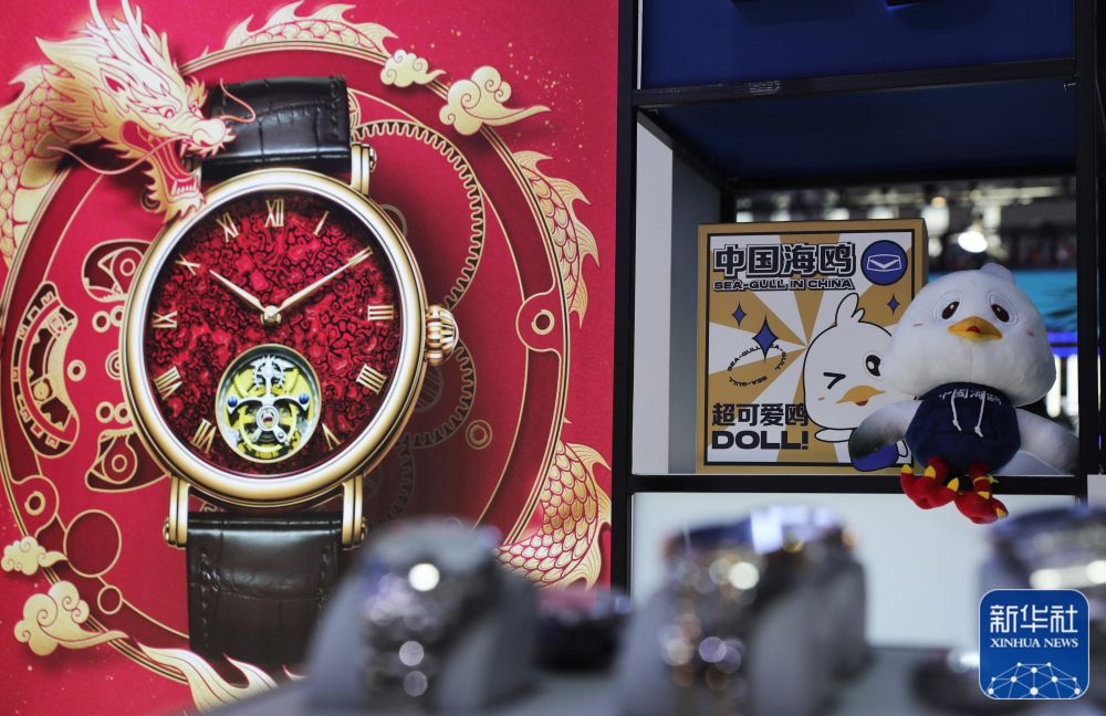 圖為天津館海鷗國(guó)潮風(fēng)格手表展柜。本屆消博會(huì)上,“老字號(hào)”帶來(lái)的國(guó)潮新品不僅有著海派文化和傳統(tǒng)文化元素,還與獨(dú)具匠心的年輕創(chuàng)意相融合。