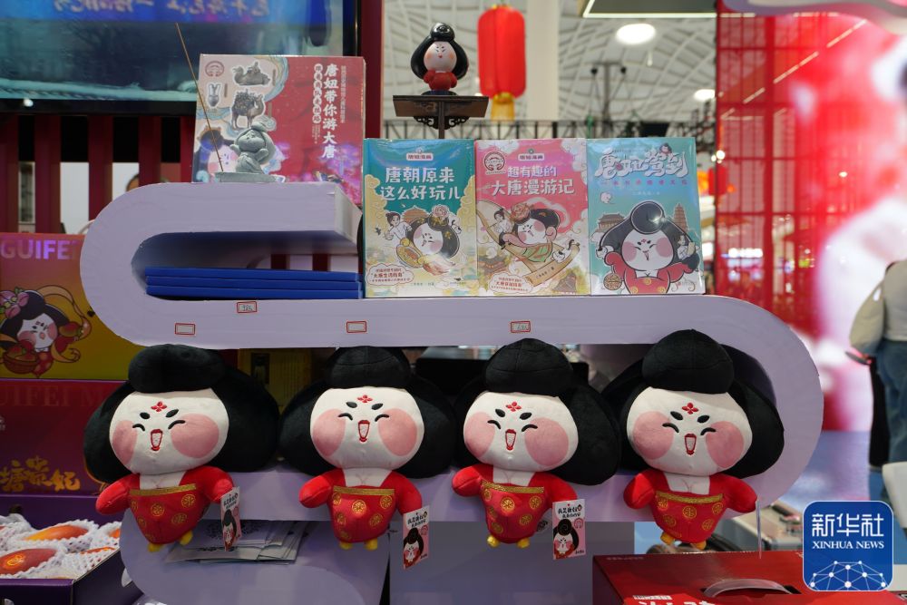 國(guó)貨特色潮品展區(qū)陜西展臺(tái)展示了“唐妞”系列文創(chuàng)產(chǎn)品。“唐妞”的卡通形象取材于陜西歷史博物館館藏文物——唐代彩繪仕女俑。新華社記者楊冠宇 攝