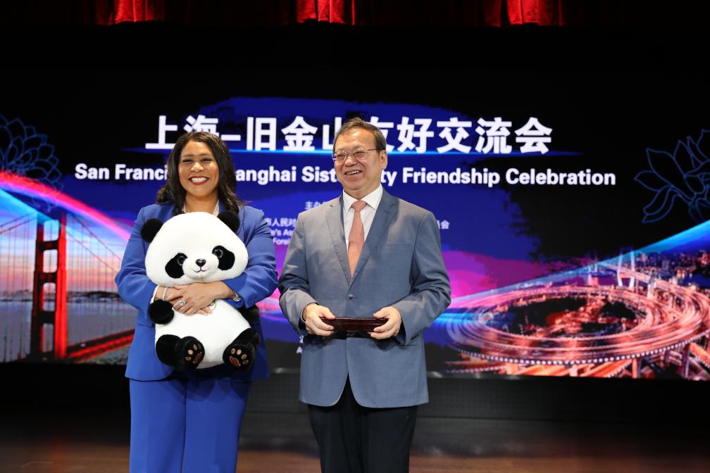 20日,上海市人民對(duì)外友好協(xié)會(huì)會(huì)長(zhǎng)陳靖(右)向布里德贈(zèng)送熊貓玩偶。新華社記者陳杰 攝