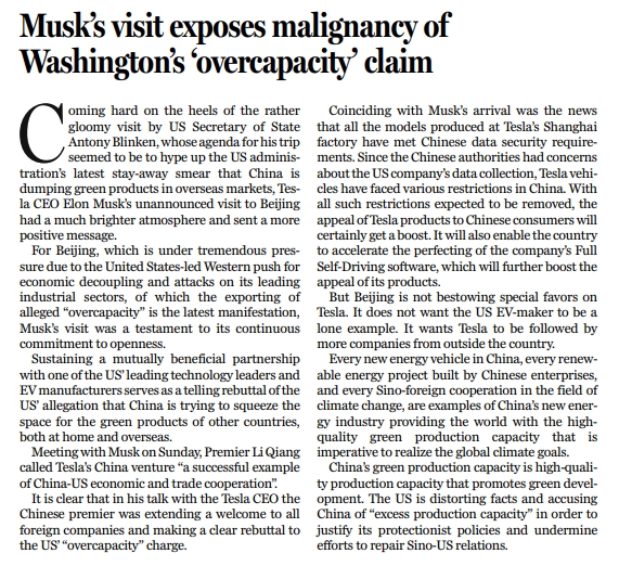 原標題:Musk's visit exposes malignancy of Washington's 'overcapacity' claim