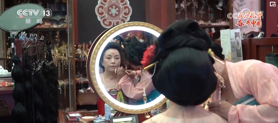 在陜西西安,有這樣一位年輕人,她仿佛擁有一種復(fù)刻舊時(shí)光的魔力。敷粉、畫(huà)眉、點(diǎn)唇,穿上漢服、戴上發(fā)飾,不到1個(gè)小時(shí),一個(gè)現(xiàn)代的女孩就穿越回了漢唐。“00后”漢服妝造師胡芯銀,讓今人和古人在裝束上相逢。