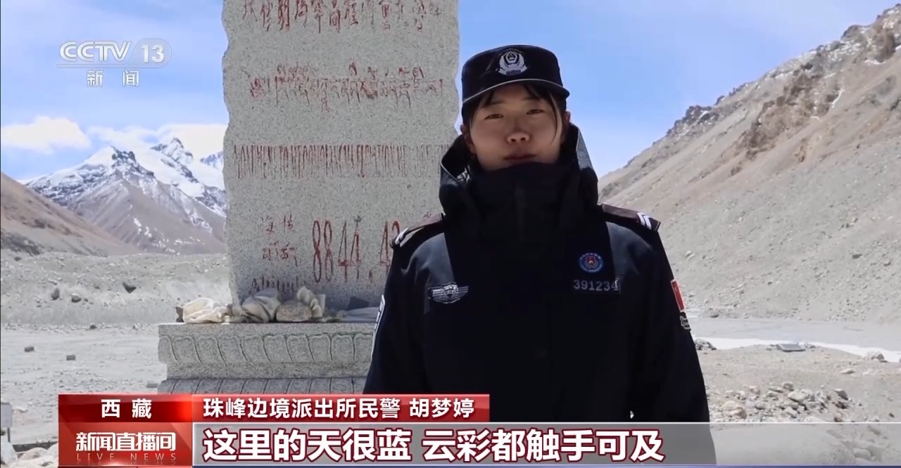 珠峰邊境派出所民警 胡夢婷:這里的天很藍(lán),云彩都觸手可及。珠穆朗瑪峰,世界最高峰,對(duì)于我來說不再是課本上那遙不可及的存在,而是我已經(jīng)抵達(dá)并駐守的地方。