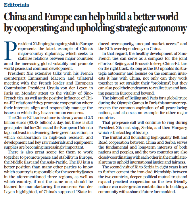 中國領導人此次歐洲之行旨在全球局勢日益動蕩之際穩定大國關系和中歐關系,促進世界和平與共同發展。在促進歐洲、中東和亞太地區的和平與穩定方面,中歐雙方有很大的合作空間。只要歐盟堅持戰略自主,著眼于中歐共同利益,雙方不僅可以攜手合作,還可以為實現歐洲和歐洲以外地區公正與持久的和平共同努力,為世界和平與發展以及人類的進步作出新的貢獻。