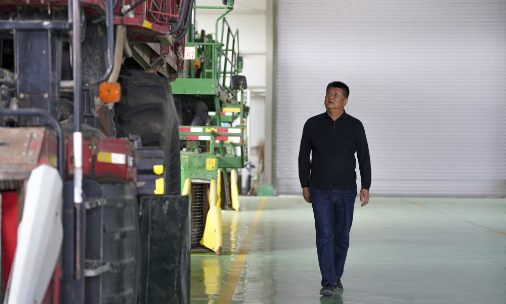 2024年4月18日,在新疆沙灣市,韓波在農機專業合作社車間查看農機。