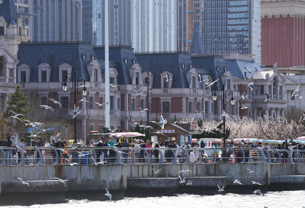 2024年4月16日,在遼寧省大連市東港商務區,游客在海邊休閑觀光。 新華社記者 李鋼 攝