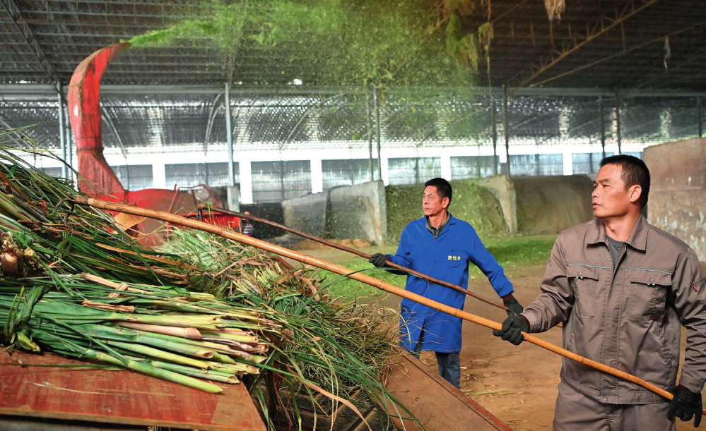 工作人員在廣西來賓市興賓區(qū)大灣鎮(zhèn)雙誠(chéng)牧業(yè)有限公司粉碎甘蔗尾葉,準(zhǔn)備制作牛飼料(2023年12月13日攝)周華攝