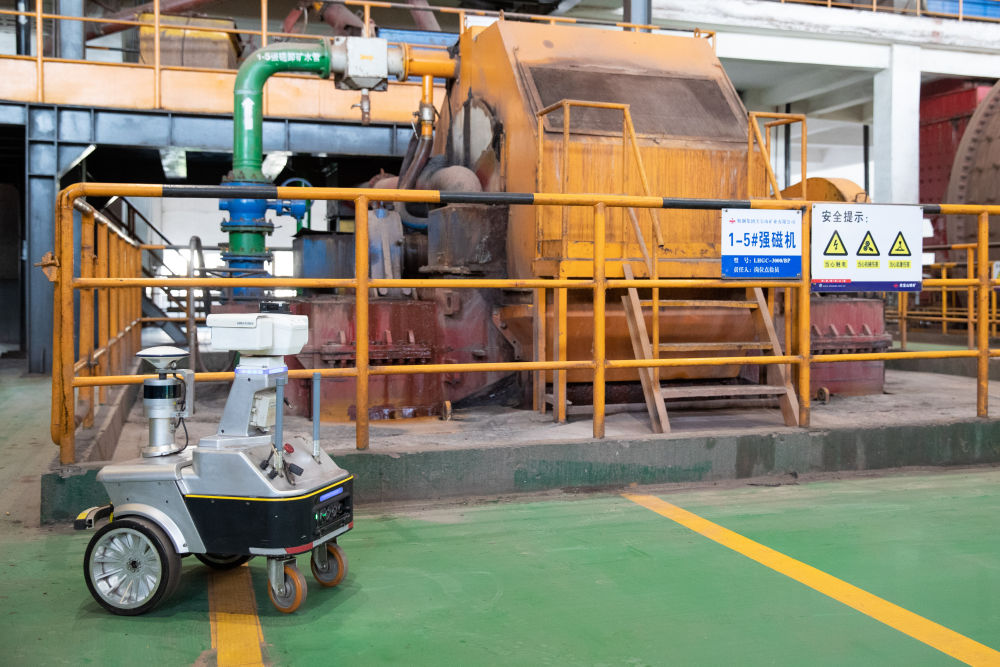 生產現場無人化,依靠什么來實現?步入磨磁車間,巨大的轟鳴聲在這個長約100米、寬約50米、高約30米的廠房內回響。登上二樓作業平臺,兩臺直徑6.2米的大型球磨機上的轉輪正在飛速旋轉。不遠處,磨磁巡檢機器人閃爍著燈光,正在采集設備溫度、振動等狀態數據。