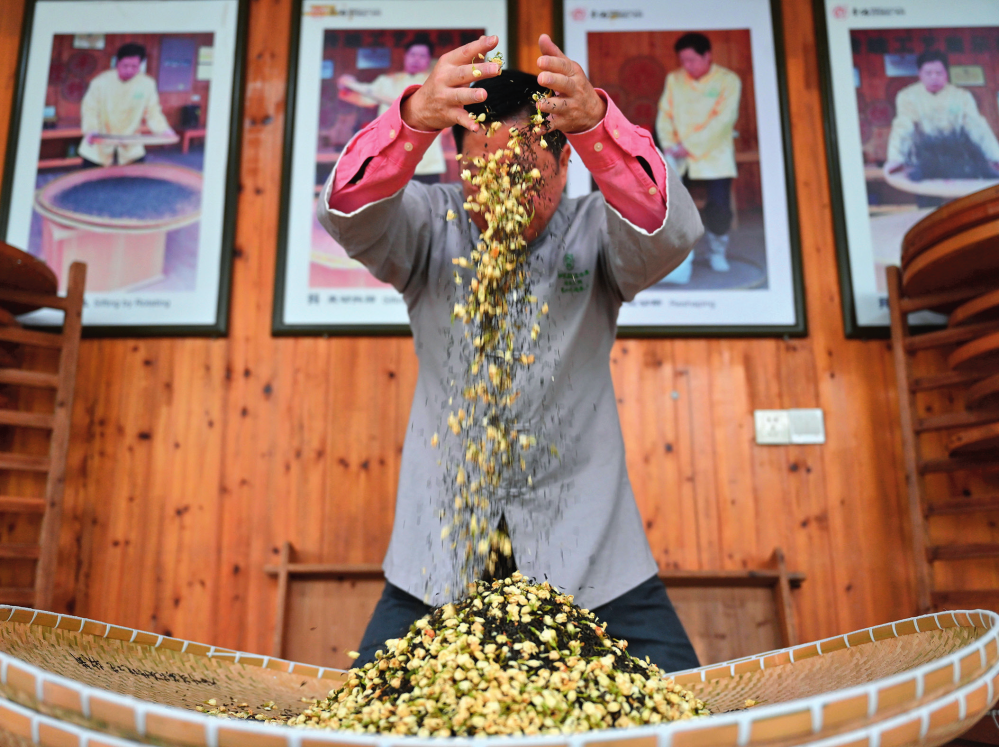 在福州茉莉花茶制茶工坊,福州茉莉花茶傳統窨制工藝大師傅天甫進行制茶的第六道工序“窨”(2022 年12 月 16 日攝)周義攝 / 本刊