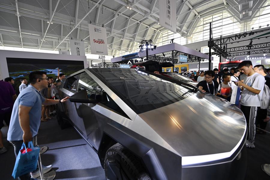 在天津舉行的2024世界智能產業博覽會上,觀眾在特斯拉展臺參觀(6月22日攝)。新華社記者 李然 攝
