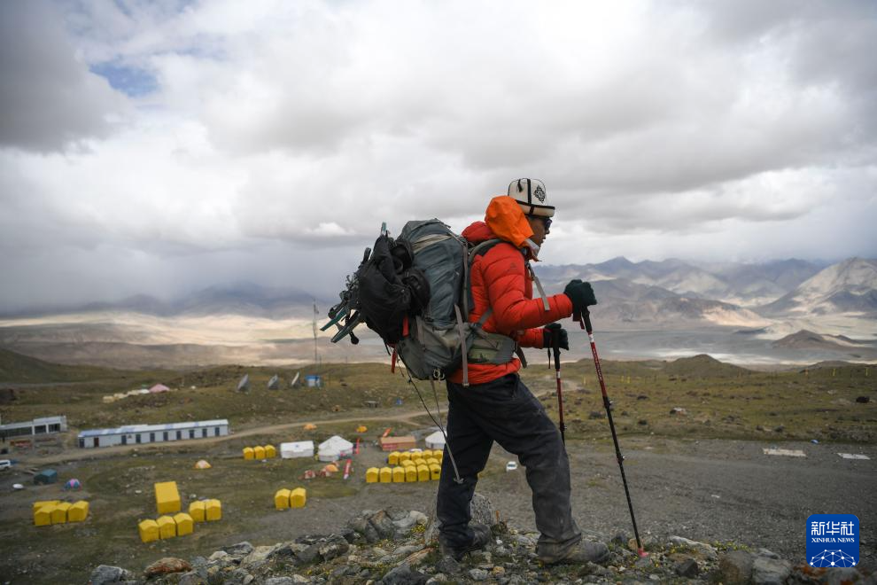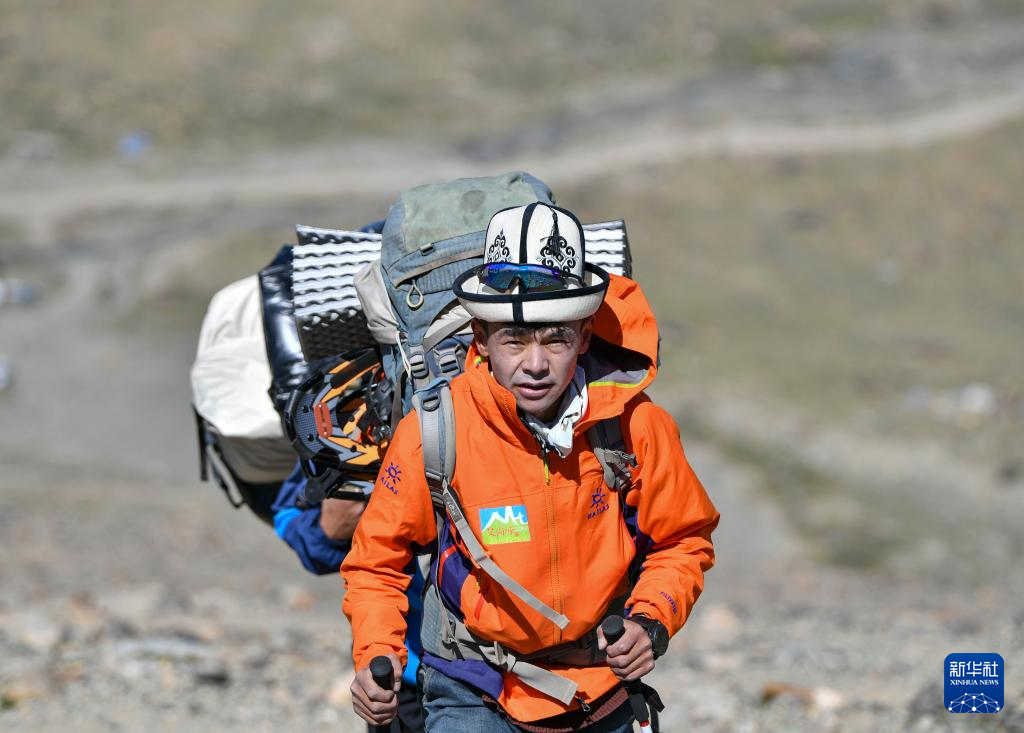 7月4日,塔西巴伊背著物品在上山途中。