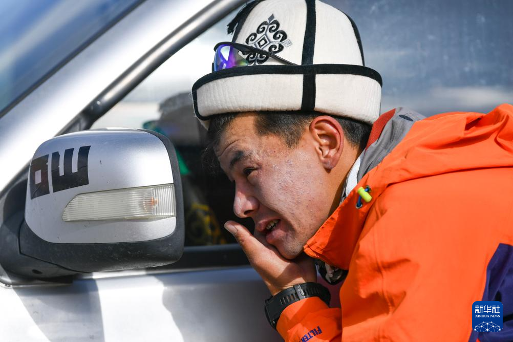 7月4日,登山隊伍即將出發上山,塔西巴伊對著汽車后視鏡涂抹防曬霜。新華社記者 胡虎虎 攝