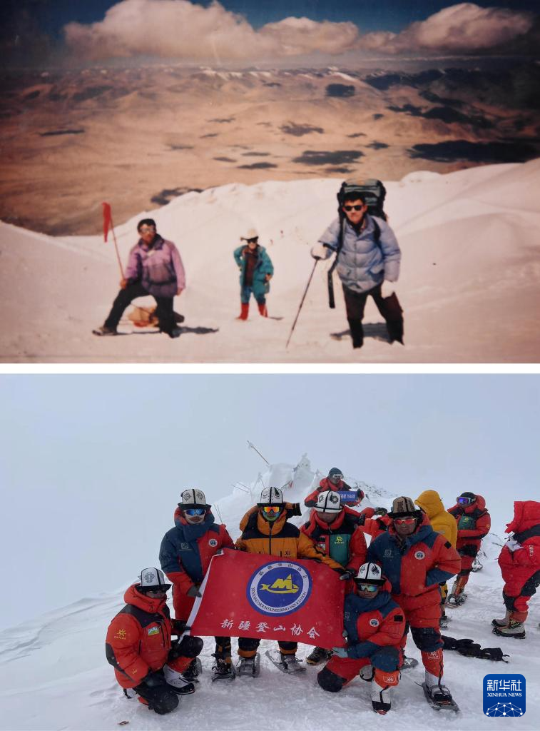 拼版照片:上圖為父親加尼拜克(左)與其兄弟于2004年8月6日一起為國外登山隊服務時在慕士塔格峰上的合影(2024年7月5日翻拍資料照片,新華社記者胡虎虎攝);下圖為兒子塔西巴伊(左三、黃衣者)和同伴于2023年7月29日登頂慕士塔格峰時的合影(受訪者供圖)。新華社發