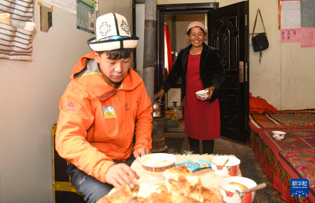7月5日,塔西巴伊下山后回到家,母親為他準備了奶茶、馕、酸奶等美食。新華社記者 胡虎虎 攝