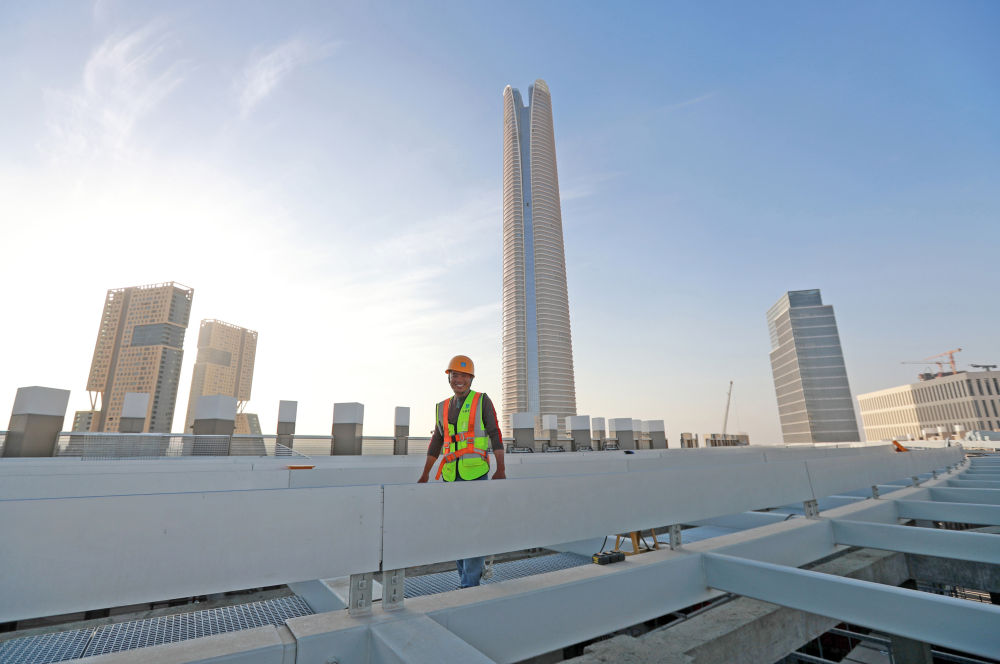 這是2023年11月22日在埃及開羅以東的埃及新行政首都中央商務區拍攝的一名在高樓樓頂施工的中國工人。新華社記者隋先凱攝