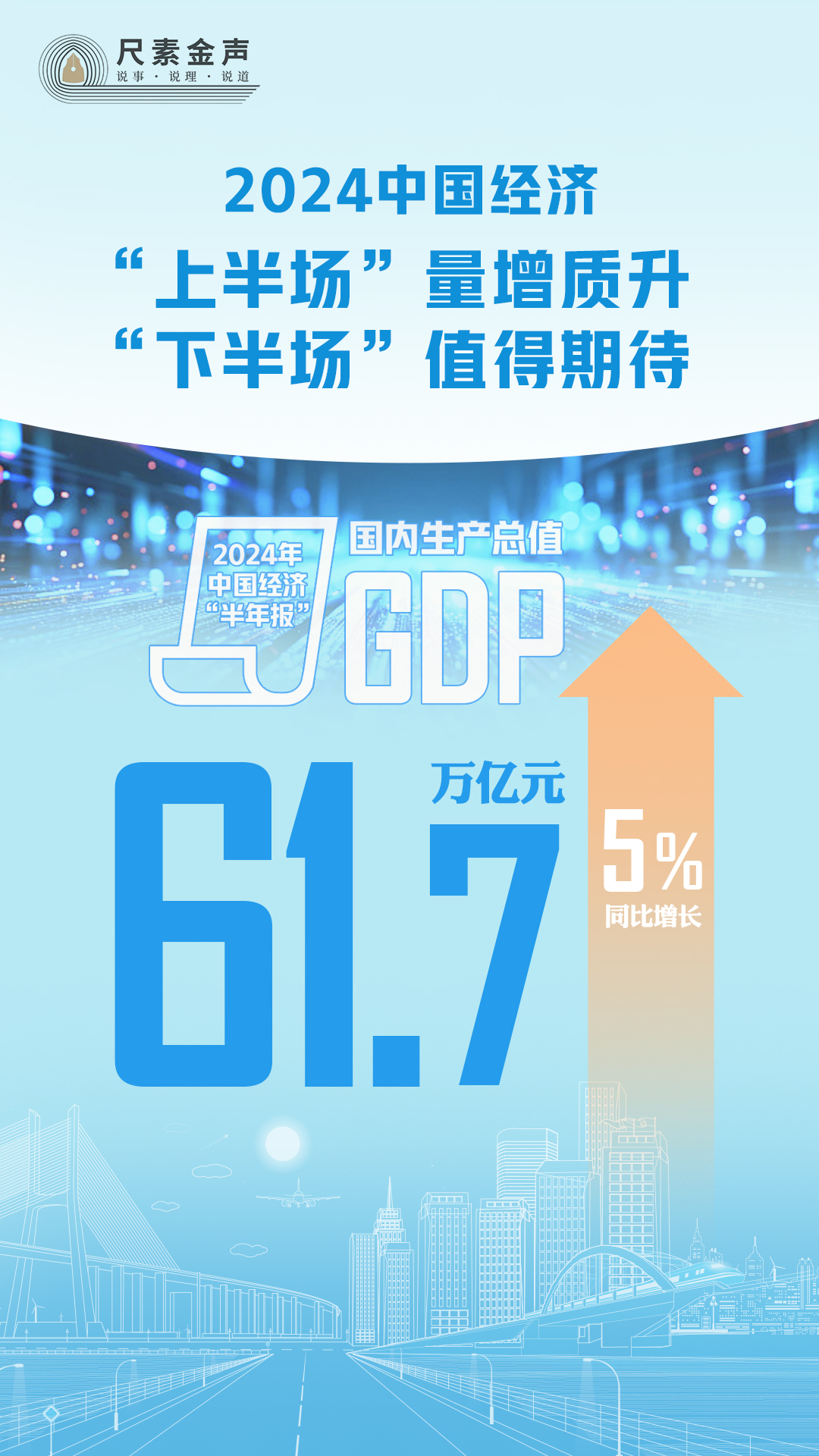 正在北京舉行的黨的二十屆三中全會,將重點研究進一步全面深化改革、推進中國式現代化。改革的“時代新篇”萬眾矚目,中國的發展也令人高度關注——同日,國家統計局發布2024年中國經濟“半年報”:國內生產總值(GDP)61.7萬億元,同比增長5%。結合二季度國內外形勢,預計上半年中國經濟增速仍將保持領先,仍是世界經濟增長的重要引擎和穩定力量。