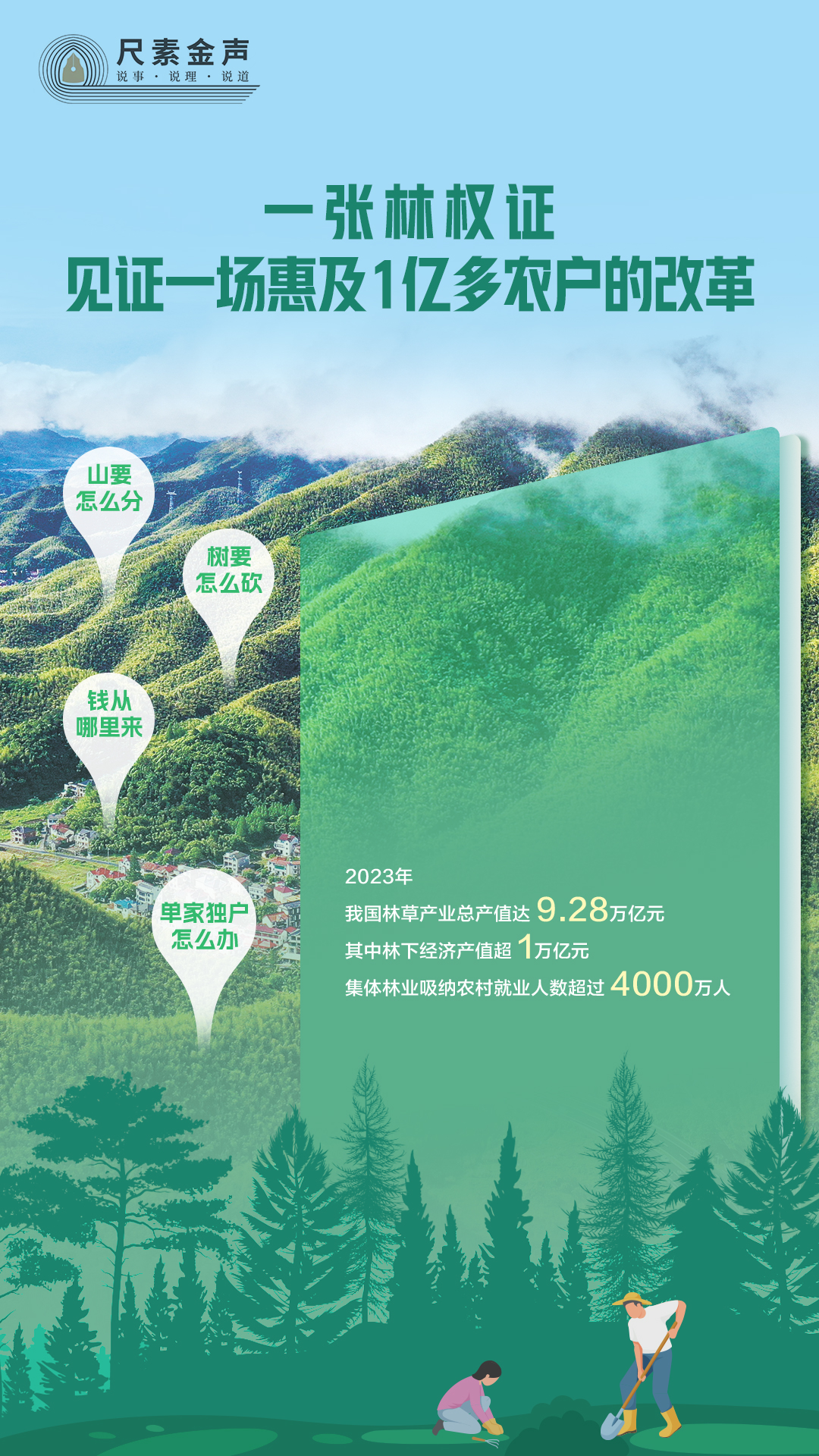 林改,改出了滿目青山,改出了金山銀山,廣大集體林區(qū)發(fā)展添活力,億萬林農(nóng)鼓腰包。去年,我國(guó)林草產(chǎn)業(yè)總產(chǎn)值達(dá)9.28萬億元,其中林下經(jīng)濟(jì)產(chǎn)值超1萬億元,經(jīng)濟(jì)林產(chǎn)量達(dá)2.26億噸,成為繼糧食、蔬菜之后的第三大農(nóng)產(chǎn)品,集體林業(yè)吸納農(nóng)村就業(yè)人數(shù)超過4000萬人。