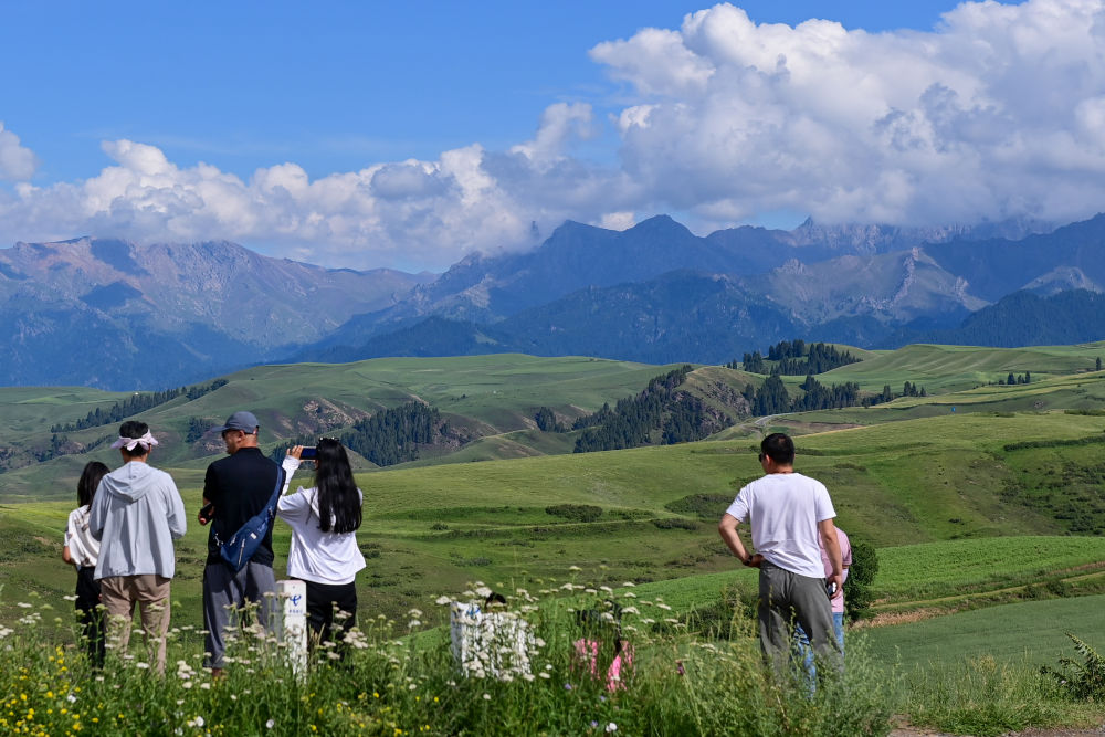 7月10日,在新疆昌吉回族自治州奇臺縣江布拉克景區,游客在拍攝萬畝小麥旱田景觀。新華社記者 丁磊 攝