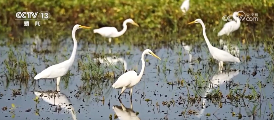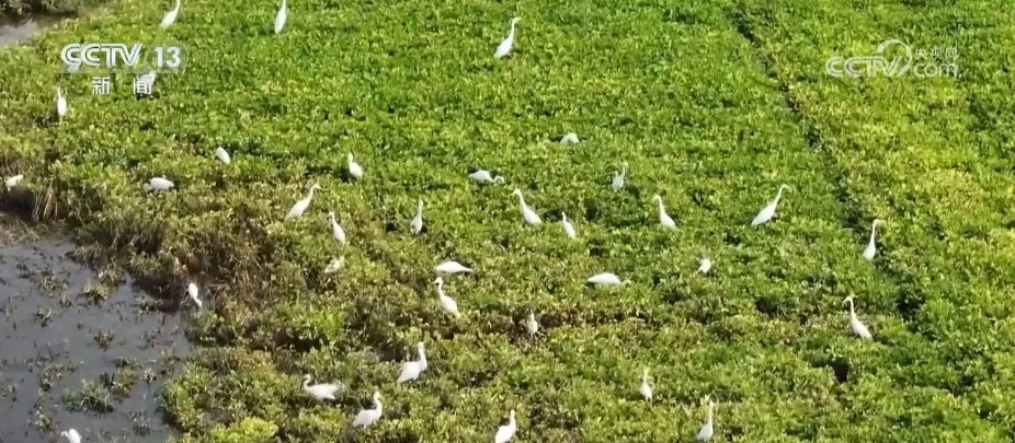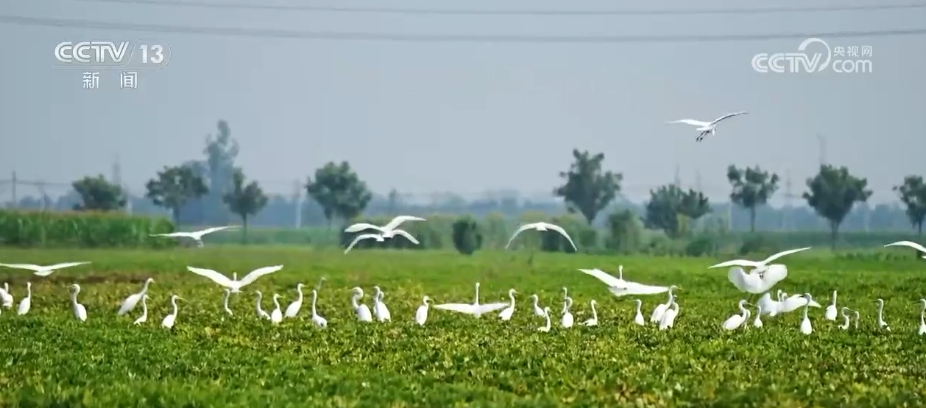 在河南周口市淮陽區(qū),由于近期降雨頻繁,當?shù)毓胚\河不少低洼地帶變成灘涂濕地,多群白鷺匯聚于此,棲息覓食。