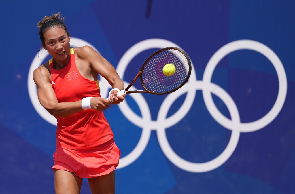 7月30日,鄭欽文在巴黎奧運會網球女子單打第三輪比賽中回球。新華社記者 萬象 攝
