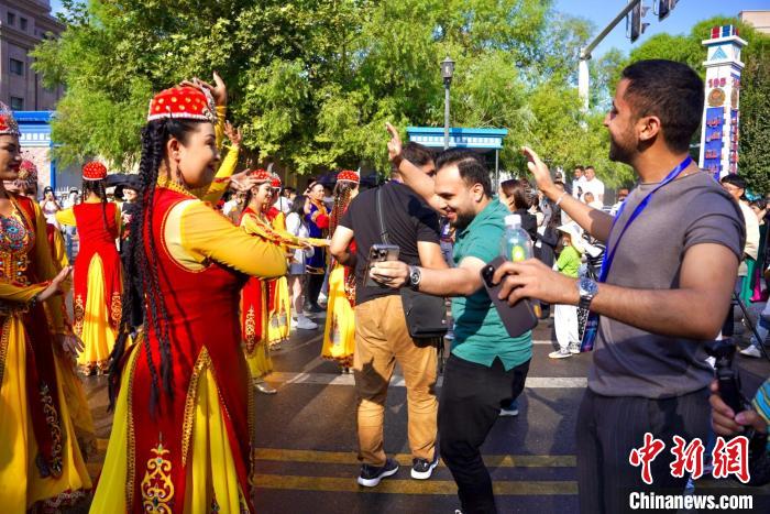 伊犁哈薩克自治州是多民族聚居區(qū),擁有47個不同民族。僅在伊寧市喀贊其民族風(fēng)情街,就居住著維吾爾族、哈薩克族、回族等13個不同民族的民眾。當(dāng)日,巴基斯坦媒體和智庫人士來到喀贊其街道,他們在街邊觀看民族舞蹈表演,還邂逅了一場維吾爾族婚禮。