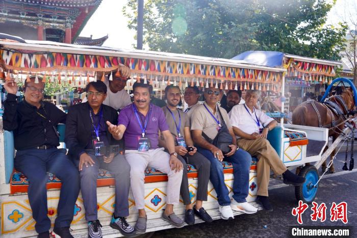 22日,巴基斯坦媒體人乘坐街區(qū)特色的電驅(qū)動馬車,參觀游覽民族風(fēng)情街。陳欣怡 攝