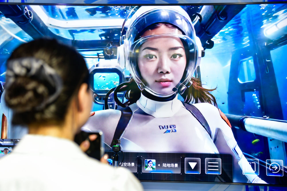 ↑8月28日,參觀者在數博會展館內體驗智能XR演播室。