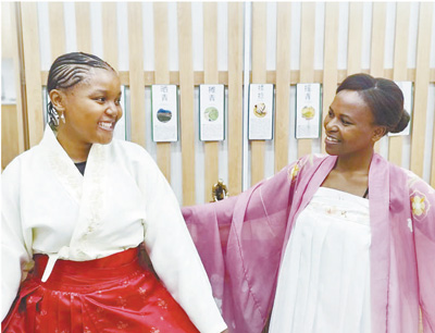 當(dāng)?shù)貢r間4月20日,為慶祝第十五個聯(lián)合國中文日,南非德班理工大學(xué)孔子學(xué)院舉辦以“說文解字,以茶會友”為主題的活動。活動參與者身穿中國傳統(tǒng)服飾,共同探討漢字和茶文化。圖為兩名當(dāng)?shù)嘏⒃嚧┲袊鴤鹘y(tǒng)服飾。
