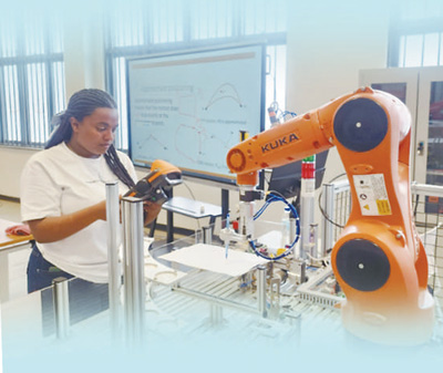 埃塞俄比亞魯班工坊由天津職業(yè)技術(shù)師范大學(xué)與埃塞聯(lián)邦職業(yè)技術(shù)培訓(xùn)學(xué)院合作建立,于2021年4月揭牌啟運,聚焦人工智能領(lǐng)域,對接當(dāng)?shù)睾献髟盒5碾姎庾詣踊c控制技術(shù)管理等專業(yè)。圖為當(dāng)?shù)貙W(xué)生在操作工業(yè)機(jī)器人。