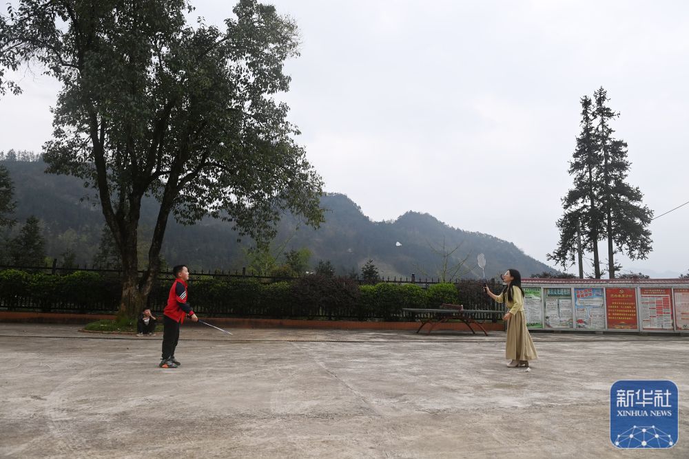 在廣西灌陽縣洞井瑤族鄉(xiāng)野豬殿小學,“95后”老師趙艷和學生打羽毛球(2024年3月27日攝)。