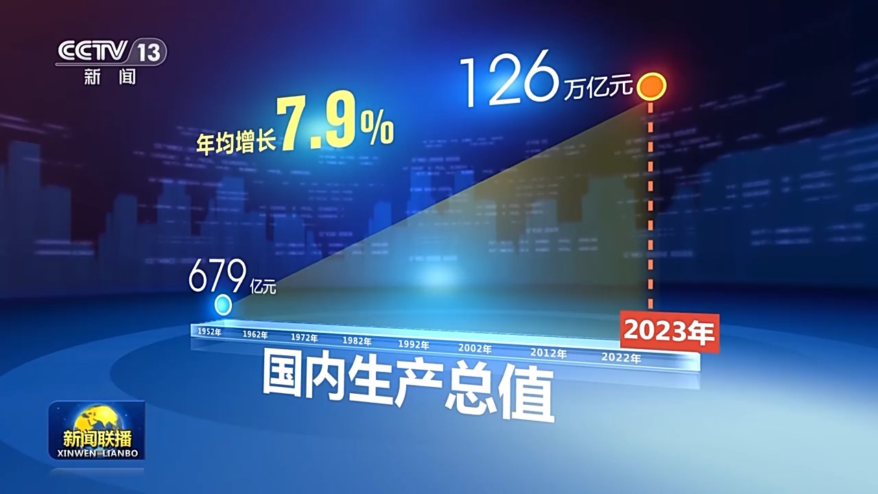 我國國內生產總值,從有數據統計以來的1952年的679億元,增長到2023年的126萬億元,年均增長7.9%。