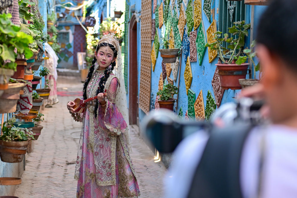 在新疆喀什古城景區(qū),游客體驗(yàn)旅拍項(xiàng)目。新華社記者 丁磊 攝