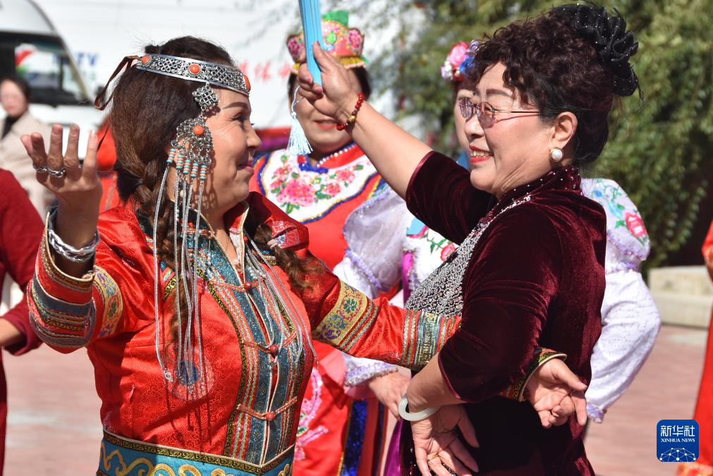 9月27日,在新疆塔城市新城街道哈爾墩社區舉行的“鄰里節百家宴”現場,社區居民在表演。