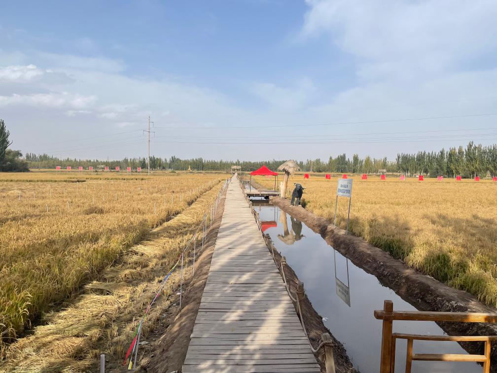這是10月16日拍攝的喀什帕哈太克里鄉水稻基地。(新華社記者彭茜攝)