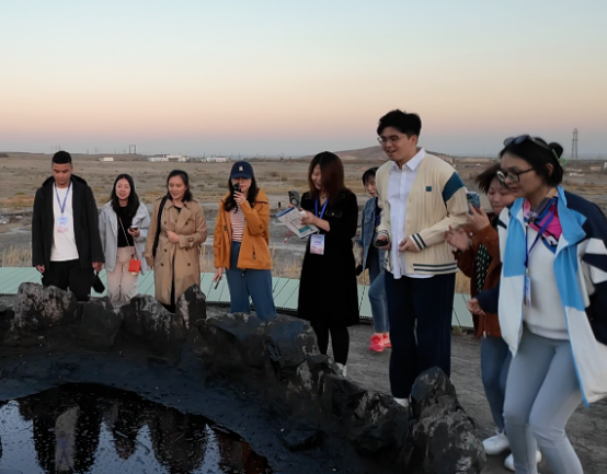 在黑油山最著名的景點——“跳跳泉油池”,黑油山景區講解員麥爾哈巴·肉扎洪帶領訪問團代表們利用壓力傳導作用,在它的周圍邊喊邊跳,眼見著它冒的泡泡越來越多,讓大家興奮不已。麥爾哈巴·肉扎洪說:“經過三代人的努力,克拉瑪依變成了現在這樣宜居宜業宜游的現代化高品質城市,希望可以把克拉瑪依艱苦創業的精神傳達給大家,也可以把這種活力傳達給大家。”