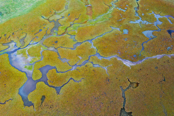 這是2022年9月17日在甘肅省甘南藏族自治州瑪曲縣拍攝的黃河上游重要水源涵養地阿萬倉濕地內的一處沼澤景觀。占地562萬畝的瑪曲濕地是世界上保存最完整的濕地之一,被譽為“黃河之腎”(無人機照片)。新華社記者 郎兵兵 攝
