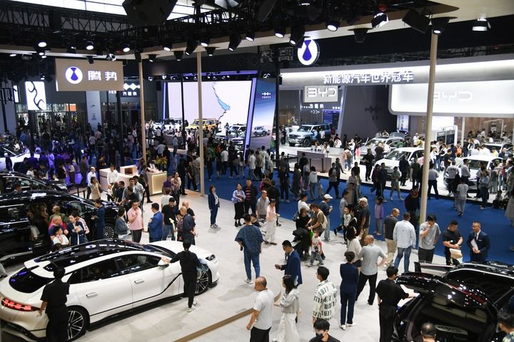 2024年10月1日,參觀者在2024第十九屆西安國際車展參觀新能源汽車。新華社記者 張博文 攝