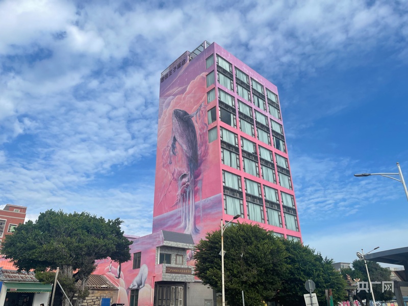 紅海灣開發區遮浪街道水龜寮村海濱街建筑外立面的“夢境鯨山”畫作(央廣網見習記者 張順鵬 攝)