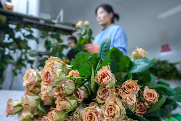 2024年8月23日,在云南晉寧花卉產業現代化示范園采后處理中心,花農將鮮切花放入自動分揀流水線上進行分揀。新華社記者 陳欣波 攝