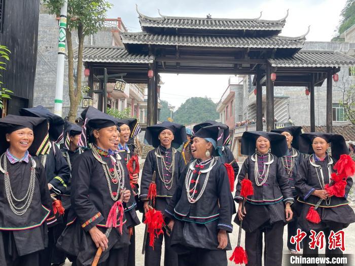 近日,在廣西那坡縣,“黑衣壯”民眾唱起山歌迎客。 黃令妍 攝