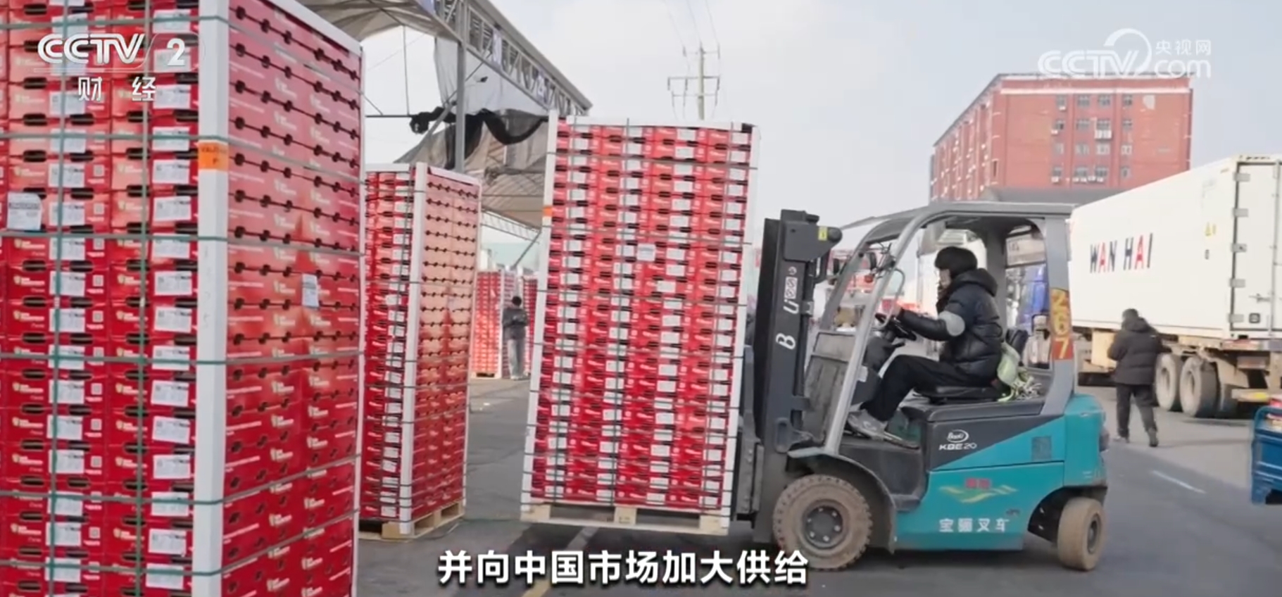 這家果蔬市場(chǎng)最近迎來了進(jìn)口水果的銷售高峰。在車?yán)遄咏灰讌^(qū)域,車輛和人員熙熙攘攘。最近每天都要從早上七點(diǎn)營(yíng)業(yè)到晚上十一點(diǎn)左右。從現(xiàn)在到春節(jié)期間,將是這里一年中最繁忙的時(shí)段。