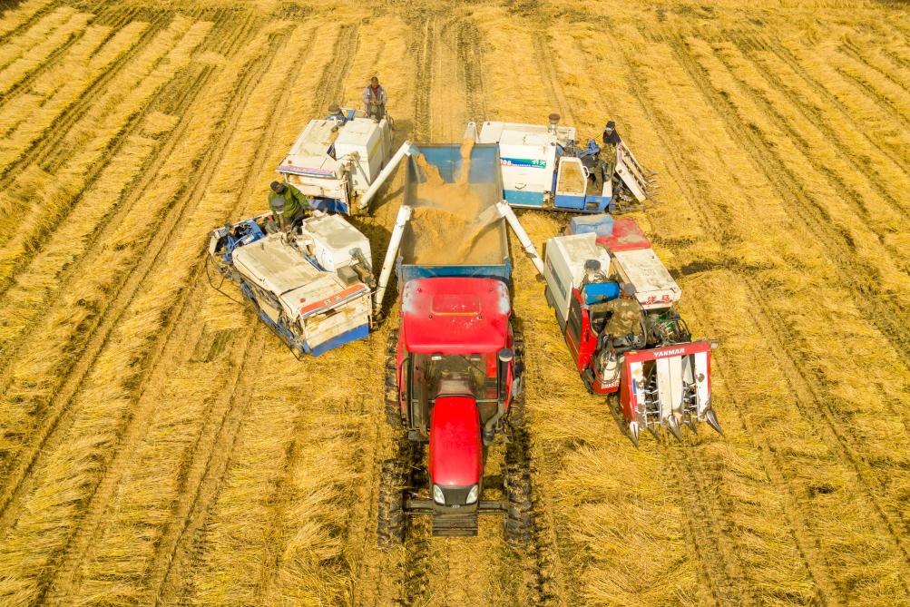 2024年10月13日,在黑龍江省綏化市北林區雙河鎮,村民駕駛收割機進行卸糧作業(無人機照片)。新華社記者 張濤 攝