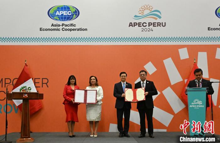 2024年11月15日,亞太經合組織第三十一次領導人非正式會議期間,中國香港與秘魯在秘魯利馬簽署自由貿易協定。圖為秘魯總統博魯阿爾特(左二)、秘魯外貿旅游部部長萊昂(左一)、香港特區行政長官李家超(右三)、香港特區政府商務及經濟發展局局長丘應樺(右二)完成簽署后合影。 香港特區政府新聞處供圖