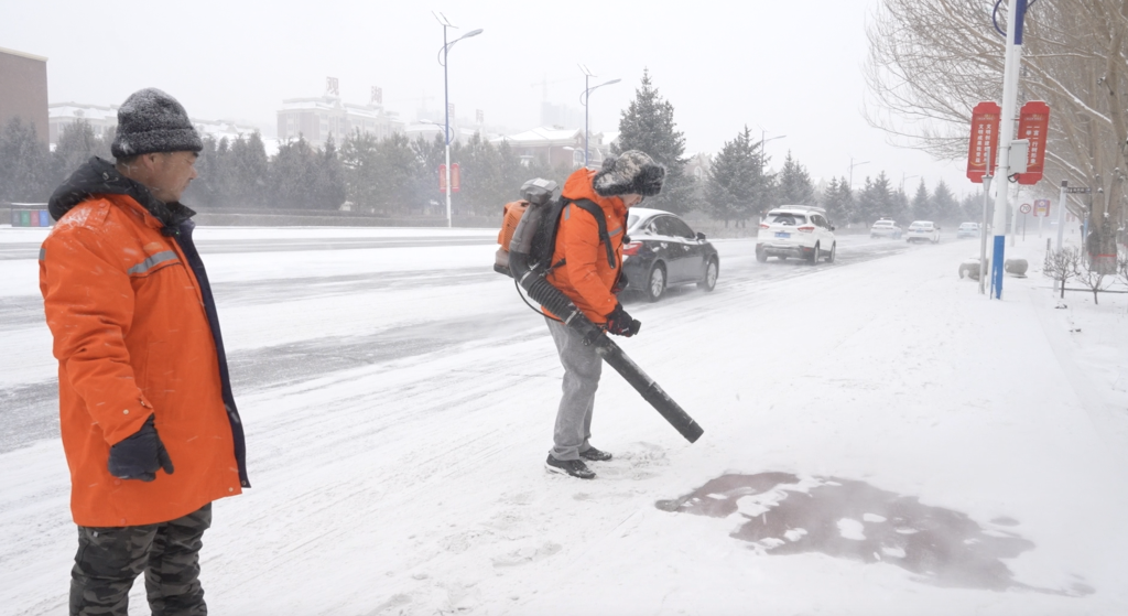 背上清掃機(jī),扣動開關(guān),左右搖擺風(fēng)槍,看著成片的浮雪被吹散,記者似乎找到了“童趣”,然而很快便體會到了這項(xiàng)工作的不易:十多公斤對記者來說不算重,但它并不像書包那般柔軟,堅硬的汽油機(jī)轟鳴震動,沒有緩沖地拍打著脊背。短短十多分鐘,起初的新鮮感和樂趣便已消失,只有噪音為伴。