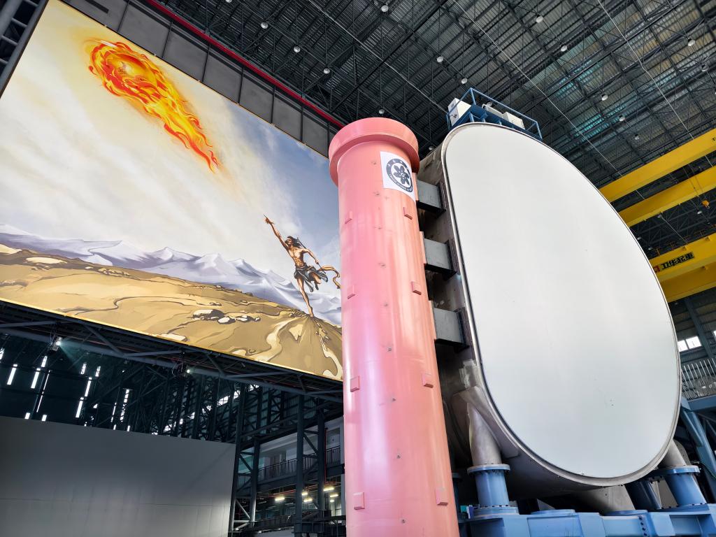 在11號廠房,墻壁上高達十幾米的夸父逐日畫像,襯托著一座形似“橘子瓣”的巨大腔體,讓科技藍為主色調的空間里有了活躍的神韻。未來,八個這樣的“橘子瓣”合而為一,下一代“人造太陽”將在里頭進行“燃燒”實驗。
