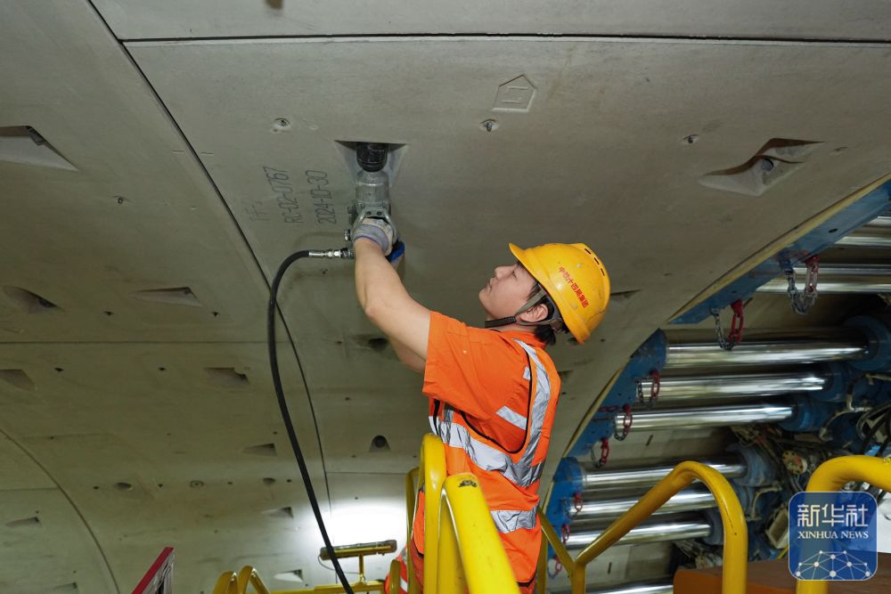 2月25日,中鐵十四局施工人員在甬舟鐵路金塘海底隧道“甬舟號”盾構機內進行管片拼裝作業。